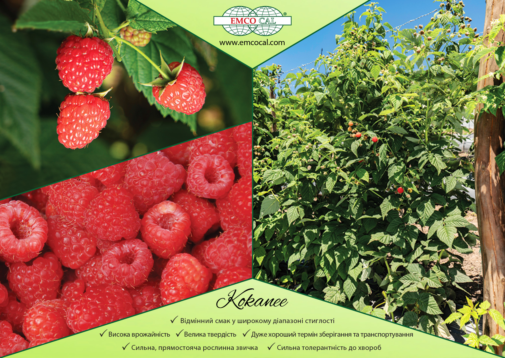 Спираючись на більш ніж 40-річний досвід роботи з розсадниками, виробниками та маркетологами в більш ніж 70 країнах, EMCO CAL розуміє потреби фермерів у сортах, які забезпечують якісну та однорідну продукцію в найкращий час для кожної країни та виробничої зони.